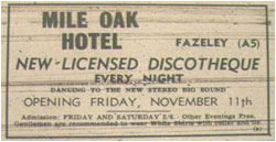 However, the disco really took off locally when on 18th November ‘66 we read in the Tamworth Herald “Discotheque Opened At Mile Oak” - A new Discotheque in the Mile Oak Hotel opened on Friday night complete with the "new stereo big-sound" and with the appearance of an exclusive nightclub – complete with chromatic lighting. Also, a little earlier, the Beat 66 club at the Foseco Sports and Social Club had big name acts performing with the addition of a “discotheque with our resident DJ - Jeff Owen” (Geoff Owen – Ed.) This venue including the disco, was to really take off in 1967.