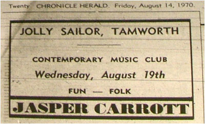 The Nolans, Jasper Carrot and Ruby Murray also played locally. Mr. Carrot performed at a new venue in the town, the Contemporary Music Club (upstairs at the Jolly Sailor). In a feature in the Tamworth Herald of 19th June, we read how “The club is designed to cater for the fans of the blues, folk and progressive types of music.” and “One of the main features of the club is that amplification will only be used when necessary and dancing will not be allowed as the club is for musical appreciation only.”